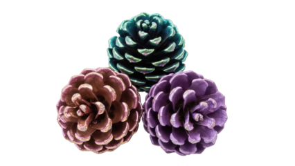 Isolated group of colorful pine cones. Collection of festive evergreen tree seeds. Holiday decoration