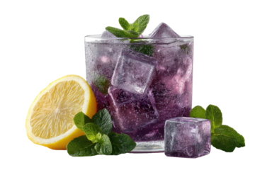 A vibrant purple drink in a glass with ice cubes and mint garnish, isolated on black
