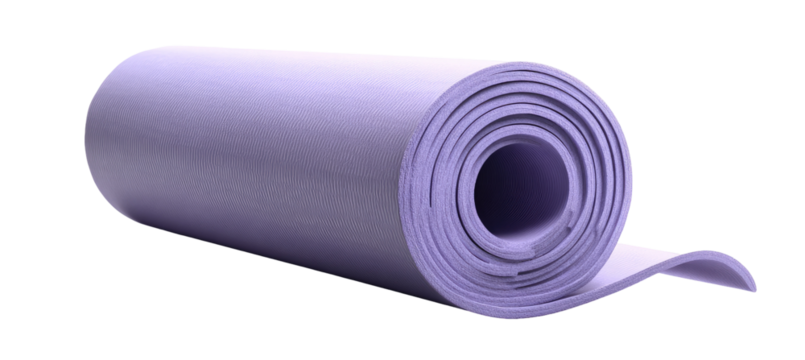 Rolled up purple yoga mat with black straps isolated on transparent background