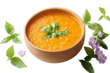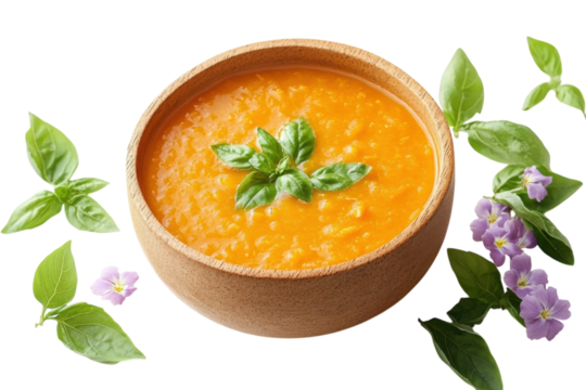 Freshly prepared orange soup garnished with basil and surrounded by green leaves and purple flowers