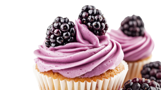 Delicious cupcake with purple frosting isolated PNG, sweet dessert with yellow paper cup on transparent background for party and celebration