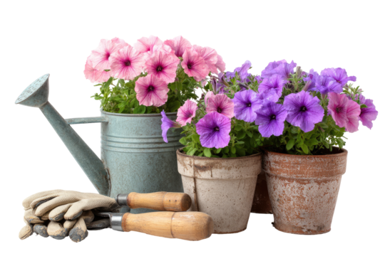 Pink and purple flowers in pots, gardening tools