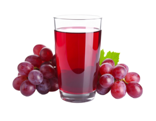 Refreshing glass of rich purple grape juice surrounded by plump ripe grapes and a vibrant green leaf, perfect for healthy beverage concepts.