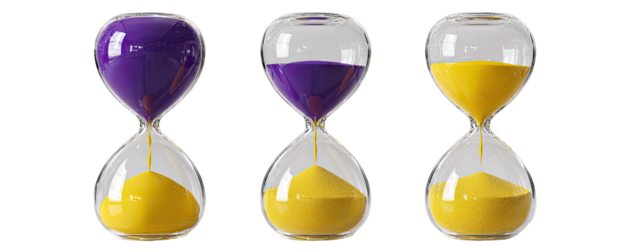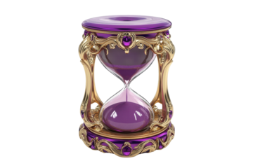 A purple hourglass with golden sand flowing through it, isolated on a transparent background