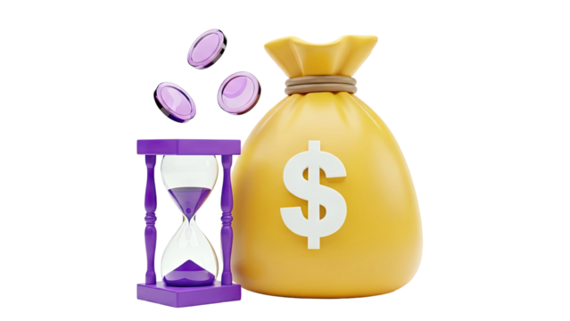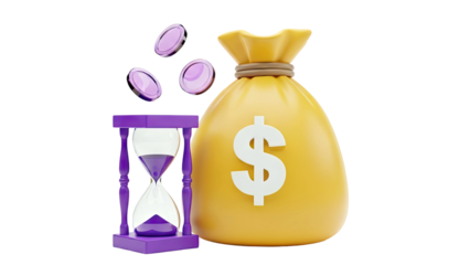 Money Bag, Hourglass, and Falling Coins 3D Render