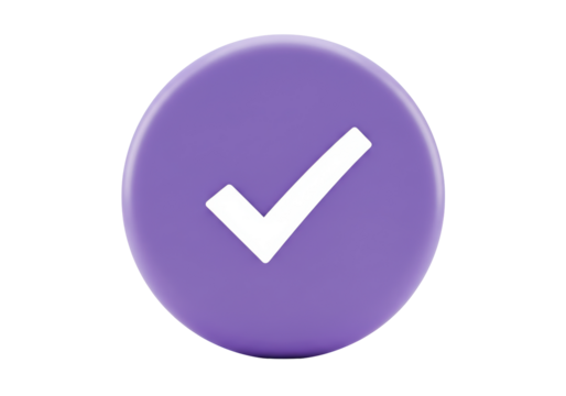 Shiny purple circle with white check mark for success and approval transparent background
