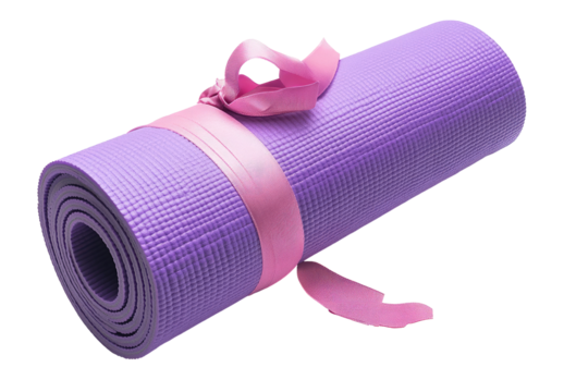 Rolled purple yoga mat isolated on white background. Perfect for fitness, exercise, and meditation routines.
