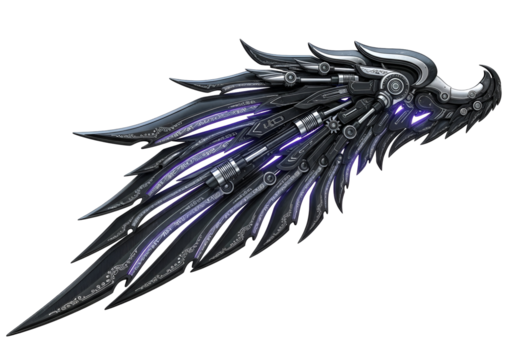 A detailed, intricate wing design, featuring metallic dark gray and silver tones, highlighted with vibrant purple accents, showcasing a complex machinery motif on a black backdrop.