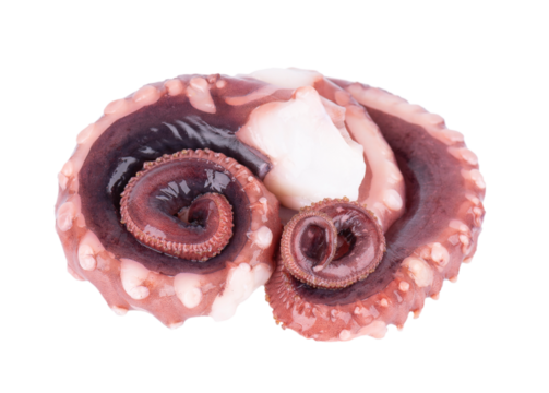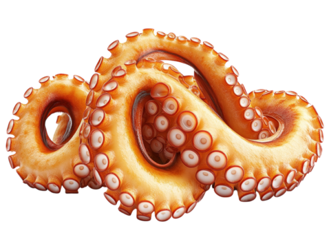 Cooked octopus tentacles with visible suckers, showing texture and detail, on a white background. PNG transparent.