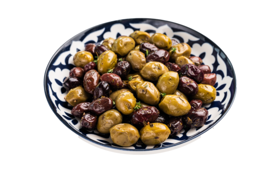 Close-up of shiny marinated olives in white bowl isolated on transparent background