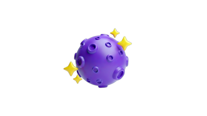3D Purple planet with craters and yellow stars isolated on white on transparent background