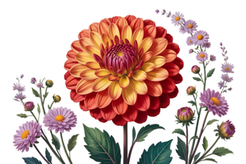 Vibrant orange and yellow dahlia flower surrounded by delicate purple aster flowers isolated on transparent background