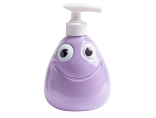 Cute purple soap dispenser with a smiling face for fun bathroom decor, cut out