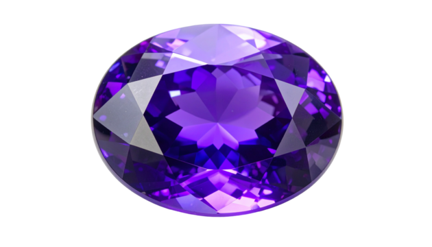 A faceted oval gemstone exhibits a vibrant purple color against black