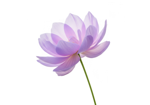 A delicate purple lotus flower with translucent petals is isolated on transparent background