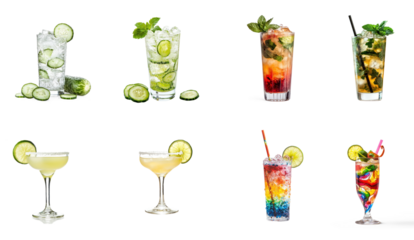 Variety of colorful frosty drinks in clear cups, garnished with fresh fruit and straws