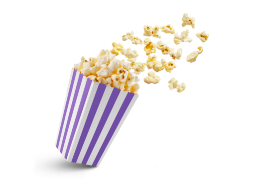 Popcorn flying out of purple white striped paper box isolated on white, transparent background, PNG, with copy space. Splash, levitation of popcorn grains.
