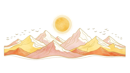 Isolated mountains in daylight with orange sun and clouds, minimalistic vector landscape