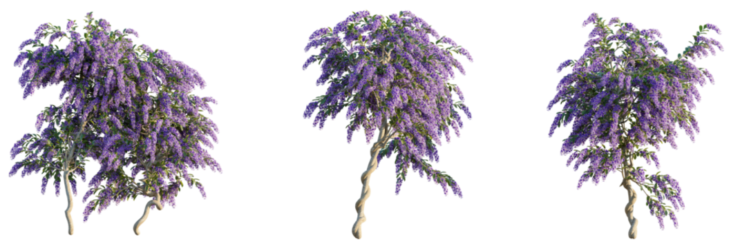 Tamarix ramosissima tree, front view, cutout, transparent background, isolate, Three flowering lilac trees create a vibrant landscape scene naturally