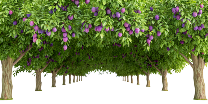 Rows of lush fruit trees with abundant purple plums create a vibrant orchard scene under a leafy canopy, isolated on transparent background.