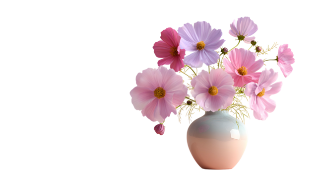 A colorful bouquet of cosmos flowers in a pastel vase against a stark black backdrop
