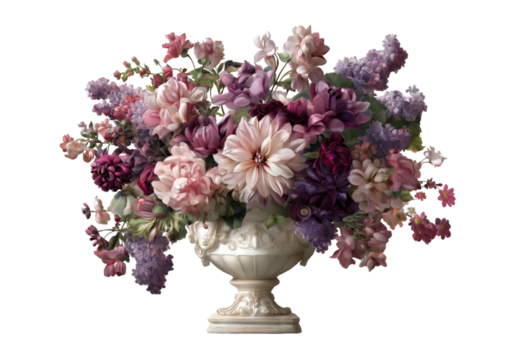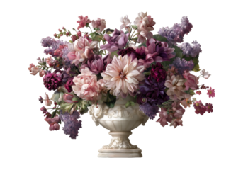 A large arrangement of pink purple and lilac flowers in an ornate white urn isolated on a transparent background