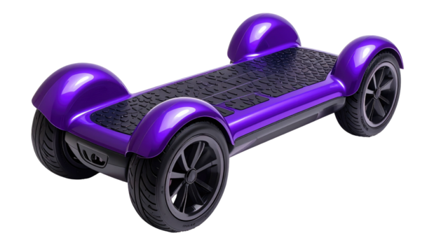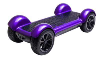 Sleek purple skateboard, futuristic design, with four covered wheels, hovering against a stark black backdrop