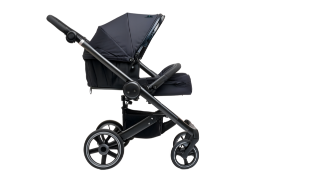 Modern Black Baby Stroller Product Shot with Silver Frame and Brown Handles isolated on Transparent Background