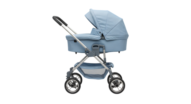 Blue baby stroll pram isolated on transparent background. Purple perambulator for newborns cut out, side view