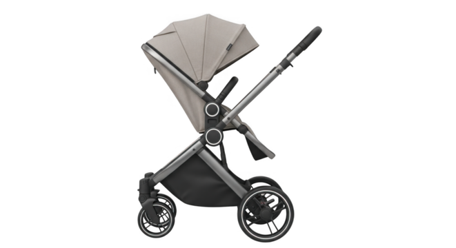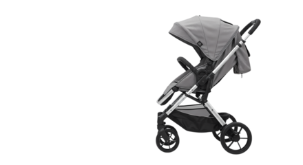 Modern baby stroller isolated on transparent background with canopy and leather handlebar