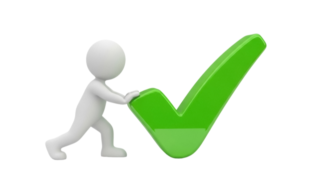 3D stick figure pushing a green check mark PNG isolated on transparent background, concept of approval and success