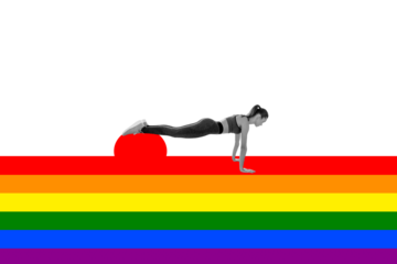Creative collage picture young fit sportswoman push up rainbow colorful symbol lgbt parade community support drawing background