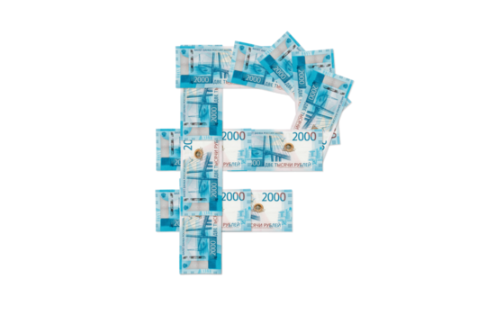 Ruble sign made from two thousand rubles notes on a transparent background. PNG file