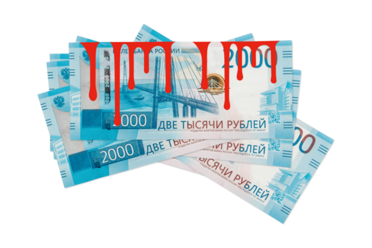 Russian rubles on a transparent background with blood. Business companies leave Russia. Rouble is the currency of the Russian Federation. Bloody money