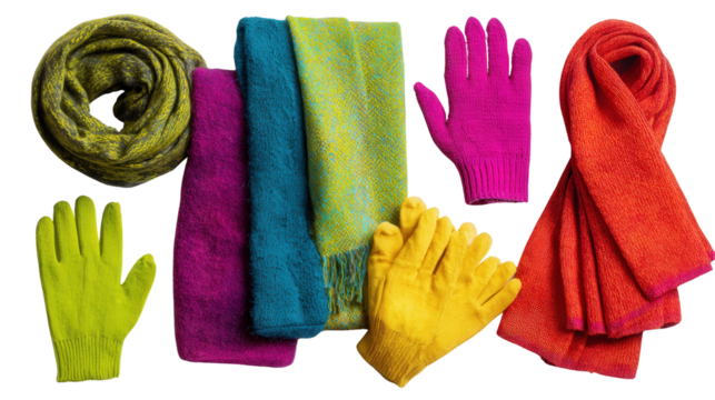 Fashionable Scarves and Gloves: A flat lay of fashionable scarves and gloves in vibrant colors, isolated on a Transparent background, PNG file.