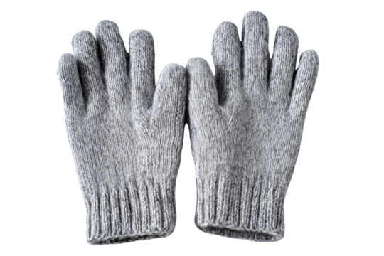A pair of warm textured grey knitted gloves displayed against a stark black background