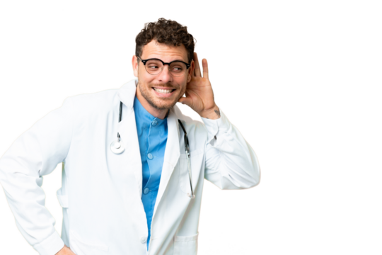 Young nurse English woman over isolated background listening to something by putting hand on the ear