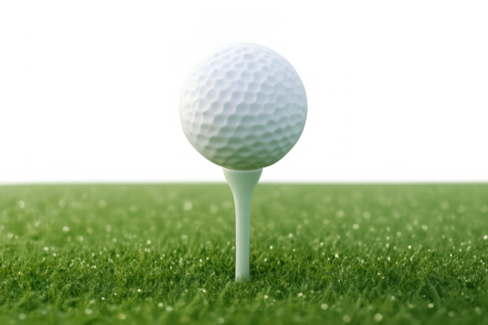Golf ball on a tee ready for a swing on green grass with a transparent background, leisure sport concept
