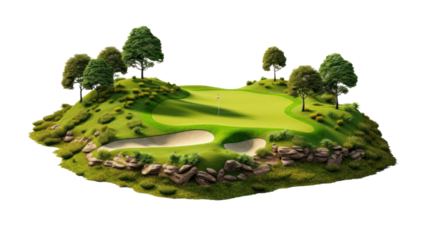 green gift box with ribbon. Golf poster design with golf course illustration. Golf course illustration with putting green and bunker sand traps. Golf background for poster, invitation, flyer