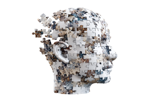 Conceptual illustration of a human head profile with a colorful jigsaw puzzle representing the brain inside isolated on transparent background