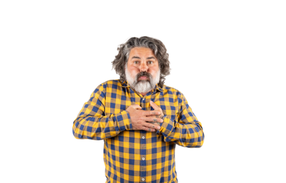 Man holding his breath with his hands on his chest on a white background