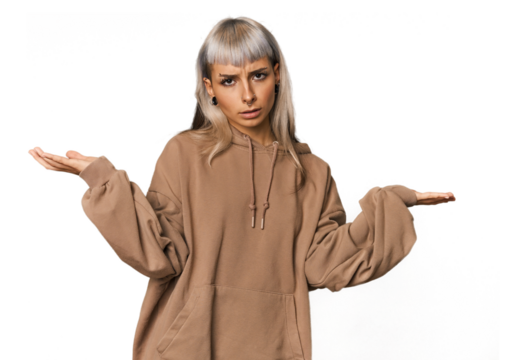 Young caucasian young woman in studio doubting and shrugging shoulders in questioning gesture.