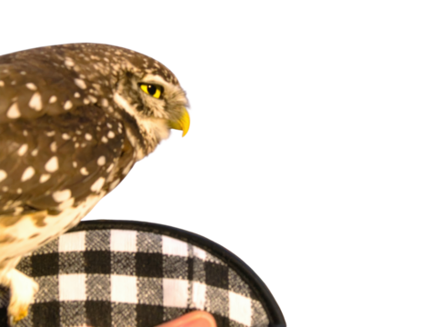 Northern Pygmy Owl Perched on Shoulder CloseUp Portrait.
