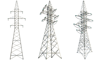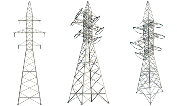 Three metallic electricity pylons standing in a row, showcasing different heights on transparent background.