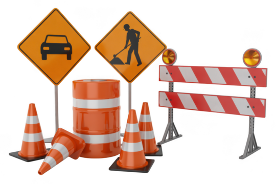 Elevated view showcasing safety gear, including warning lights and traffic cone on black backdrop