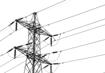 Photo of high voltage power tower, electriciy pylon and electric line cables isolated on white or transparent background, png cut out