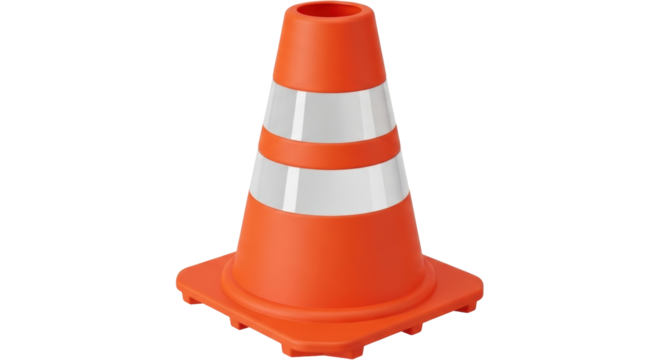 Isolated orange traffic cone with reflective stripes for safety, roadside hazard, construction