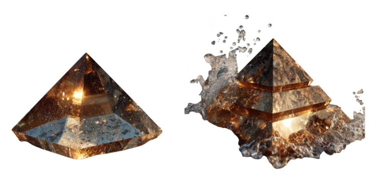 Two faceted amber colored pyramids one intact and one shattering into liquid droplets isolated on transparent background