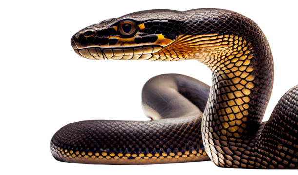 Beautiful Reticulated python aka Malayopython reticulatus snake in color platinum. Isolated cutout on transparent background.