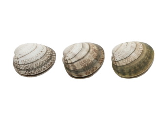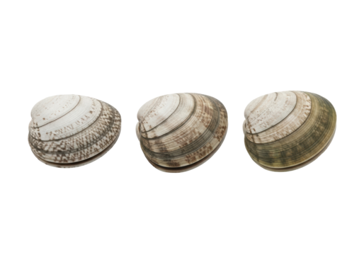 Three raw, unopened littleneck clams, ridged, mottled grey-white to greenish, isolated on pristine transparent studio background with shadowless light, concept for fresh seafood product photography